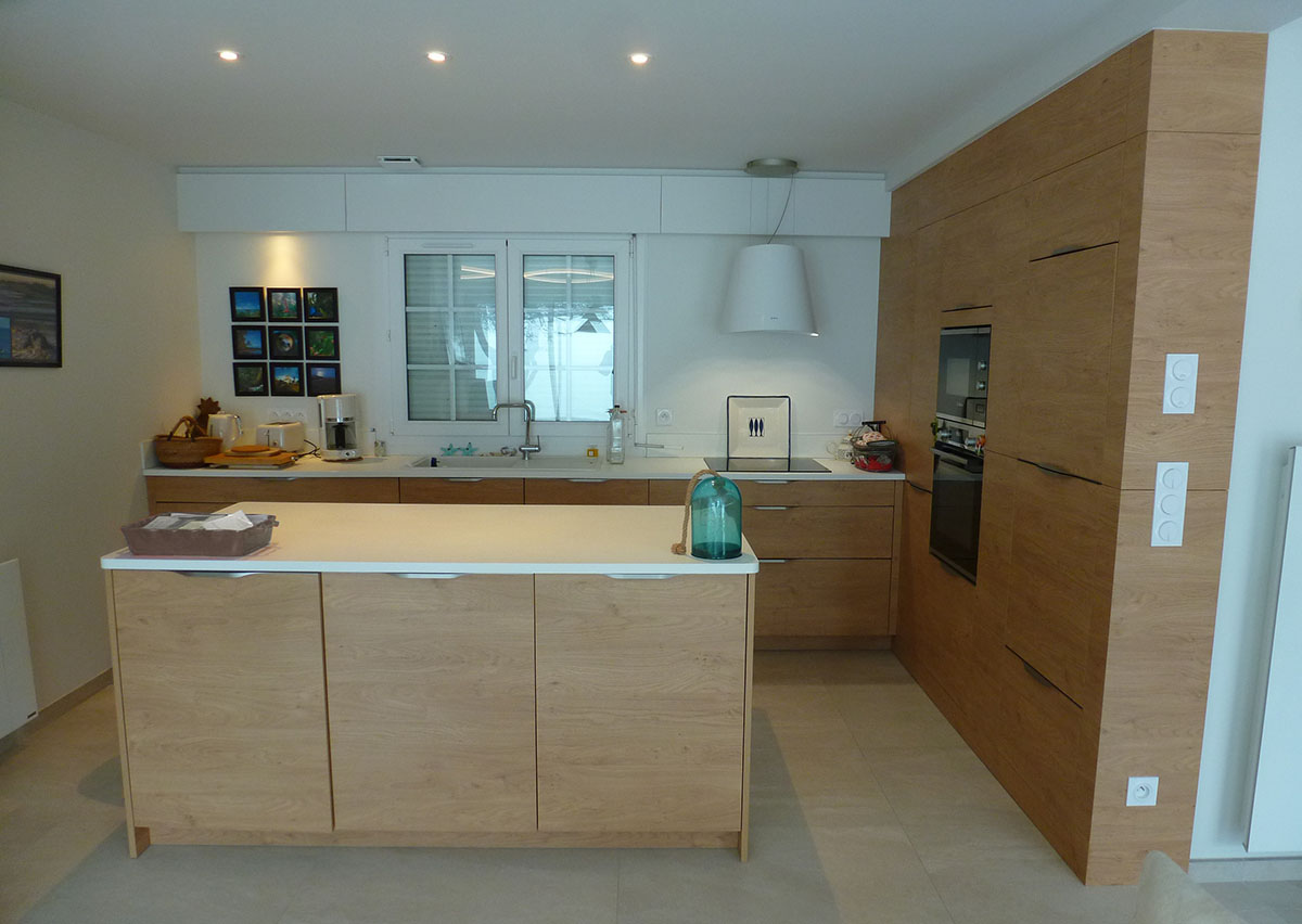 Le cœur de cet aménagement repose sur le décloisonnement des espaces et l’ouverture d’un mur porteur, afin de créer un vaste espace de vie ouvert, plus lisible et plus fonctionnel. Cette intervention structurelle a nécessité une étude technique approfondie pour garantir la stabilité du bâtiment tout en libérant de nouvelles possibilités d’agencement. L’approche retenue s’appuie sur une intégration des aménagements pensée comme dans un voilier : chaque volume est exploité, chaque passage est optimisé, et chaque zone trouve sa place avec logique et précision. L’ouverture réalisée offre aujourd’hui une vue dégagée sur la mer, transformant la perception des volumes et apportant une luminosité naturelle généreuse. Ce nouvel espace ouvert favorise la convivialité et renforce le lien entre intérieur et environnement extérieur.