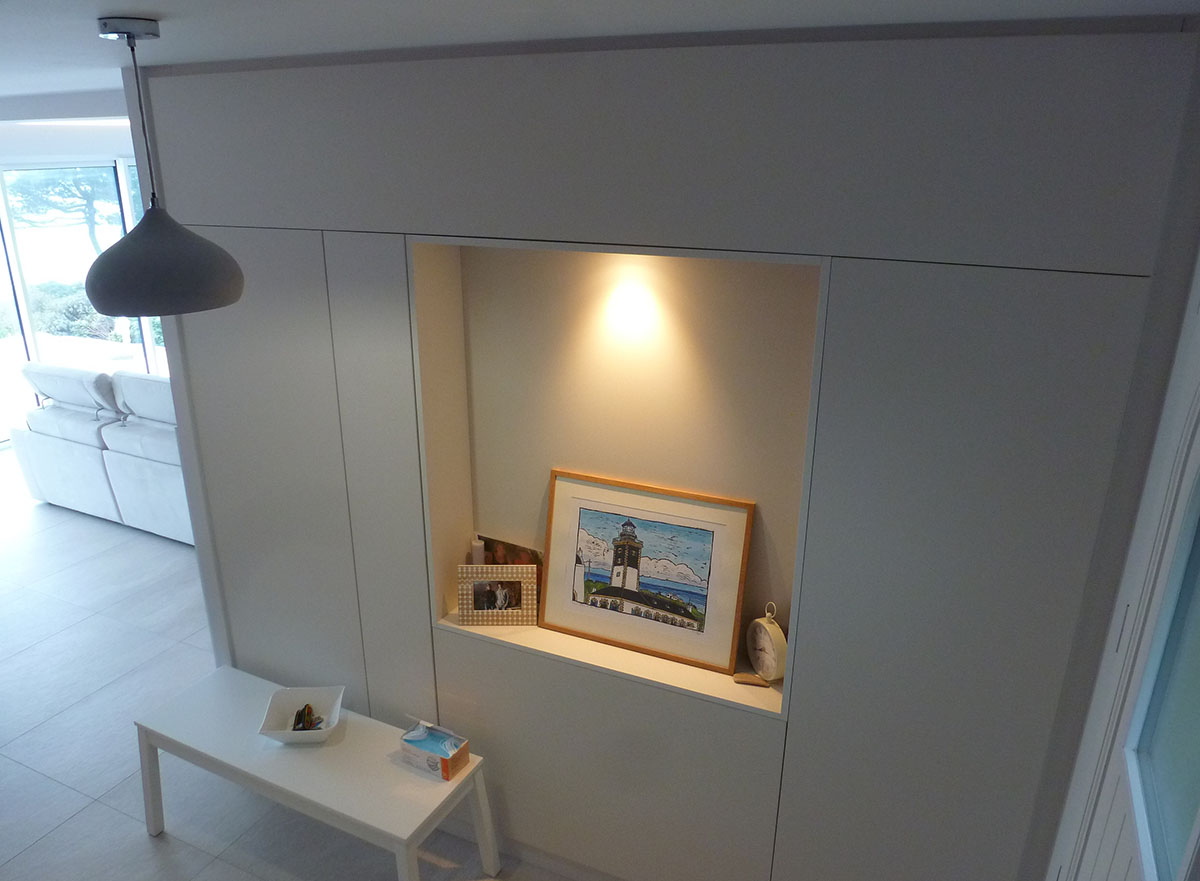 Afin de sublimer les volumes et d’améliorer le confort visuel, un travail spécifique a été mené sur la mise en lumière, avec un traitement soigné des finitions et un souci des détails à chaque étape. Des éclairages LED ont été intégrés directement dans les coffres de volets roulants, créant un éclairage discret, indirect et parfaitement cohérent avec l’architecture intérieure. Cette solution contribue à l’optimisation des espaces en limitant les éléments visibles et en renforçant la sensation d’ouverture, tout en permettant de composer différentes ambiances selon les moments de la journée. Ce projet à Saint-Gildas-de-Rhuys illustre le savoir-faire de Couedel Design dans la conception d’aménagements intérieurs sur mesure, où technique, design et cadre de vie s’harmonisent durablement.