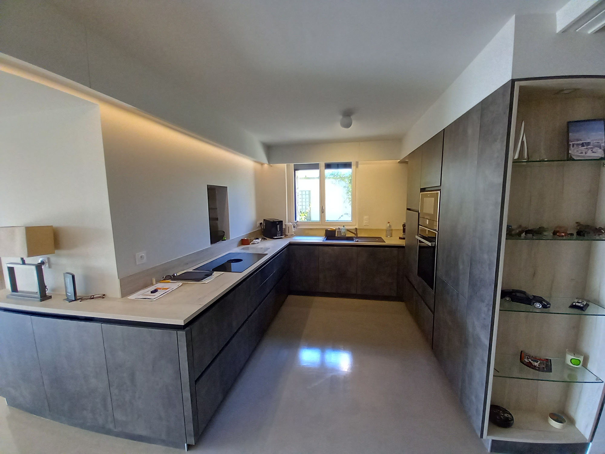 Le travail sur les volumes a constitué une phase clé de cette rénovation. Le décloisonnement et l’ouverture des espaces ont permis de rendre les niveaux plus fluides, plus lumineux et plus fonctionnels, en facilitant les connexions entre les pièces. L’intervention la plus technique a porté sur l’ouverture d’un mur en pierre d’environ un mètre d’épaisseur, avec la mise en place de renforts par IPN. Réalisés dans le respect des normes de sécurité, ces travaux structurels assurent la stabilité du bâtiment tout en offrant de nouvelles possibilités d’aménagement. Cette maîtrise technique reflète le savoir-faire de Couedel Design dans la conduite de rénovations complexes, où chaque choix contribue à l’optimisation des espaces et à une circulation plus évidente.