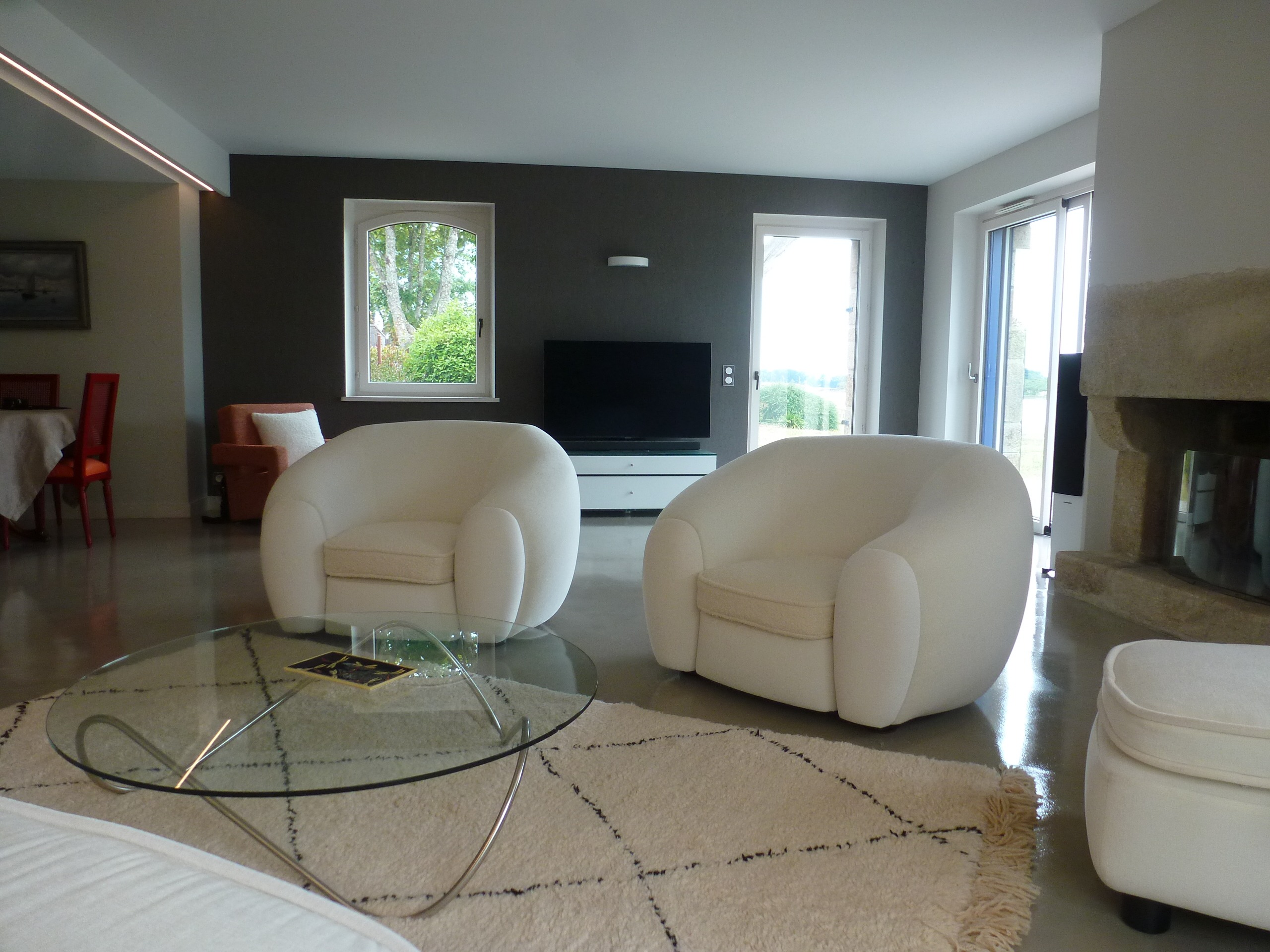 Pour finaliser l’ensemble, un large travail de mobilier sur mesure a été imaginé puis intégré au projet. Des fauteuils personnalisés, des meubles vasque et une porte de cabine sur mesure ont été réalisés afin d’épouser parfaitement les volumes et l’esthétique de la maison. L’intégration des aménagements pensée comme dans un voilier a guidé certains choix : rangements discrets, fonctions bien définies et utilisation intelligente de chaque recoin. Chaque élément a été conçu avec le souci des détails, pour conjuguer fonctionnalité, confort et design, tout en affirmant une identité forte à chaque niveau. Grâce à une approche cohérente, cette rénovation à Arzon propose aujourd’hui un cadre de vie harmonieux, contemporain et durable, fidèle à la philosophie de Couedel Design.